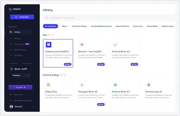Generate many types of content in under 30 seconds by simply inserting a few input fields. Generate blog topic ideas, intros, ad copy, copywriting.